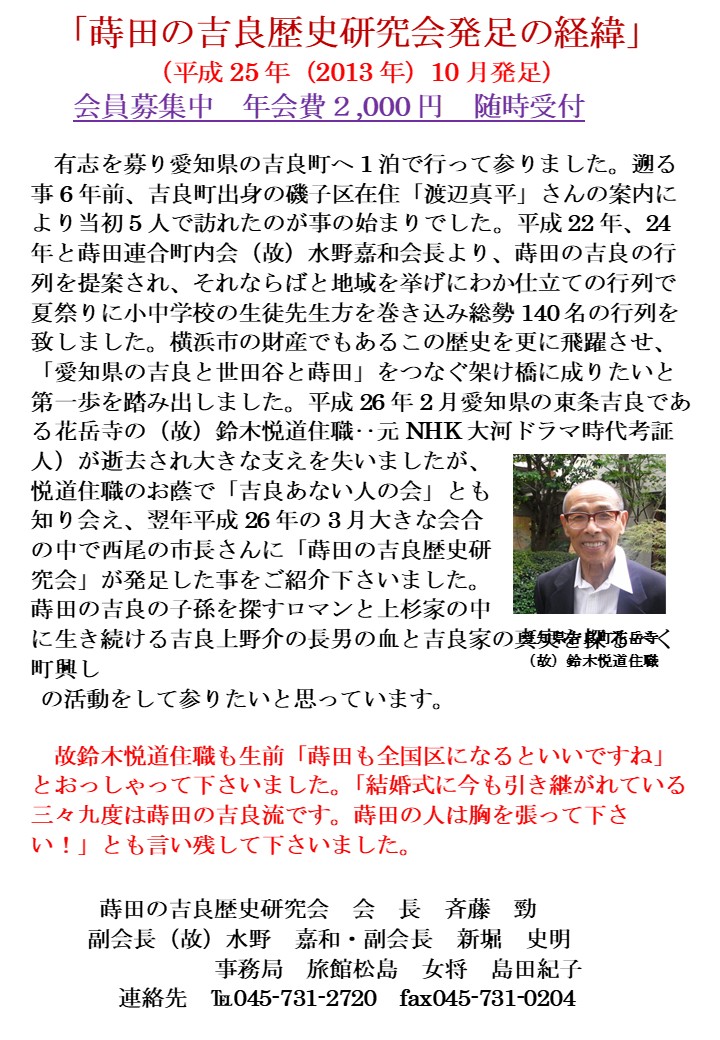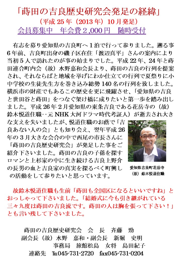 歴史研究会が発足しました経緯など添付いたします。随時会員を募集しています。年会費2,000円、旅館松島 女将 島田紀子 事務局 ℡045‐731-2720 fax045-731-0204