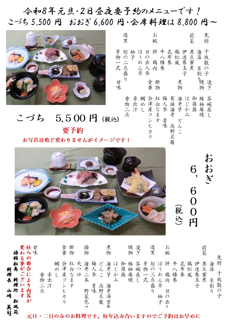 2026年元旦2日昼・夜営業のお知らせ 「要予約」  恒例 運試し先着100名空くじなし(令和7年12月29日~31日 令和8年1月3日~6日まで松風苑お正月休み)