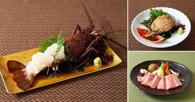 『あわびの踊り焼き又は、刺身、黒毛和牛・伊勢海老が丸々一本ついた会席料理』
